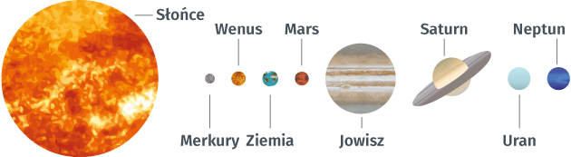 Licząc od Słońca, planetami Układu Słonecznego są kolejno Merkury, Wenus, Ziemia, Mars, Jowisz, Saturn, Uran i Neptun. Ziemia jest trzecią planetą Układu Słonecznego. Nasza Ziemia jest planetą skalistą: składa się głównie z pierwiastków ciężkich i minerałów tworzących skały. Jej kształt to lekko spłaszczona kula: z powodu obracania się wokół osi, jej promień mierzony do równika jest dłuższy, niż do biegunów. Na podstawie nagrań wykonanych w kosmosie wiemy, że nasza planeta widziana z kosmosu ma niebieską barwę. Powodem tego jest fakt, że 71% jej powierzchni pokrywa woda.