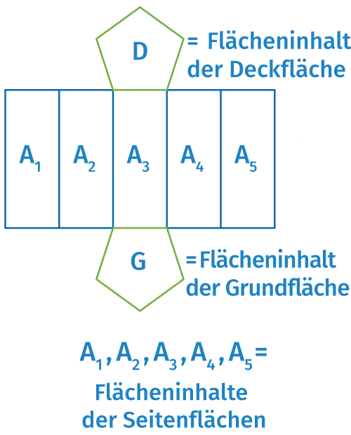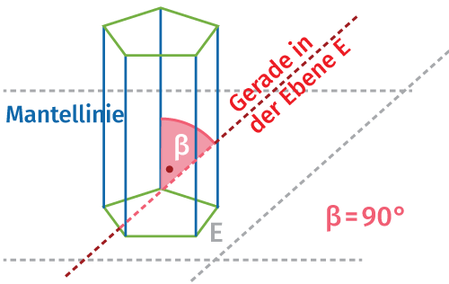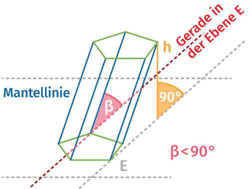 Wenn die parallelen Mantellinien eines Prismas nicht orthogonal zur Grundfläche sind, dann ist das Prisma ein schiefes Prisma. Die Mantellinien und die Grundfläche schließen in diesem Fall einen spitzen Winkel von weniger als 90° ein. Die Mantelfläche besteht aus Parallelogrammen. Ein Prisma ist gerade, wenn die Mantellinien senkrecht zur Grundfläche stehen. Die Mantelfläche ist in diesem Fall immer ein Rechteck, dessen Breite gleich dem Umfang der Grundfläche ist, und dessen Höhe gleich der Länge der Mantellinien ist.